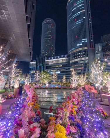 名古屋駅の名駅通りを挟んだ大名古屋ビルヂングにある屋上庭園のスカイガーデンでは、季節のイルミネーションと一緒にセントラルタワーズを撮影することができます。