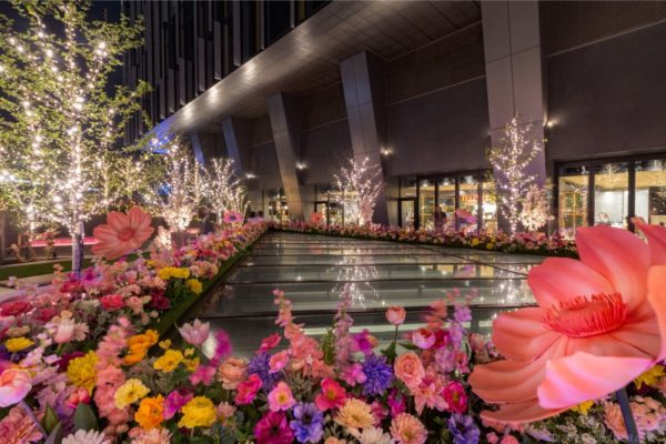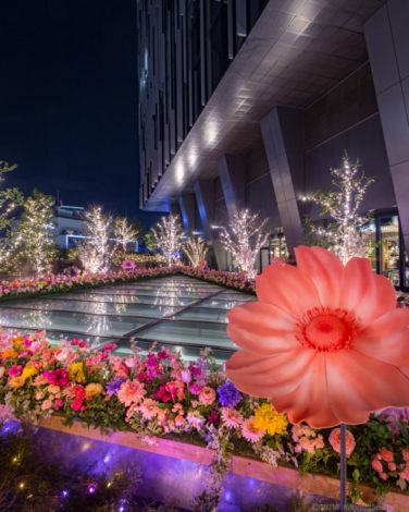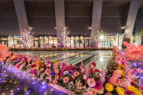 冬のイルミネーションを使いまわしパワーアップさせて、春の雰囲気が出るように鮮やかな造花に、紫やピンクのイルミネーションが追加されています。