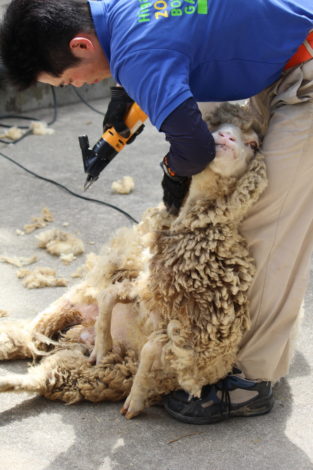 なすがままに毛を刈られるひつじさん。