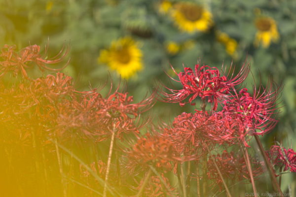 彼岸花をひまわりでサンドイッチして撮影しています。