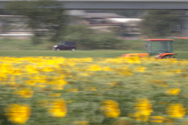 電車で流し撮りをする勇気がなかったので、刈り倒しをしていたトラクターと後ろを走る車を流し撮りしてみました。