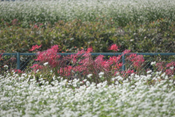 それぞれの畑は9月中旬~10月中旬に満開になり、彼岸花も周辺に咲くので夏と秋の面白い光景もみることができます。