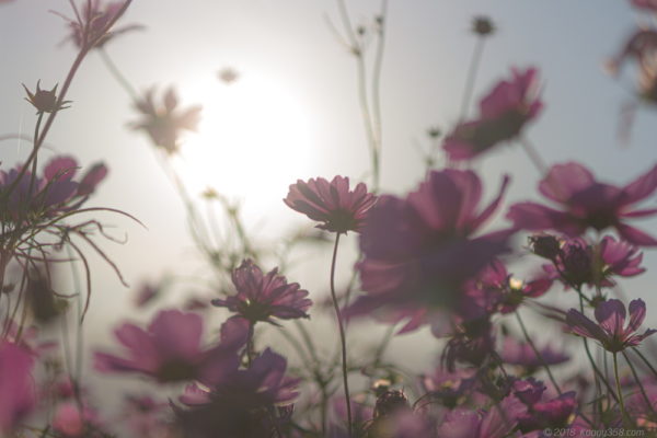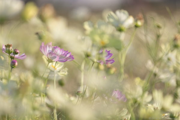 日が傾き始める時間帯に順光で撮影することで、コスモスに当たる光がキラキラと玉ボケを作ってくれます。