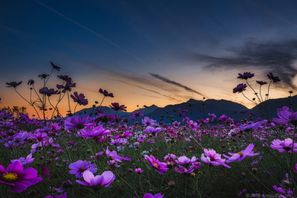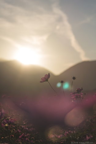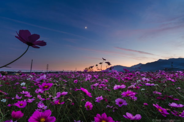 鈴鹿山脈がより大きく写せるので、マジックアワーのオレンジと併せて迫力のあるコスモスの写真が撮れました。
