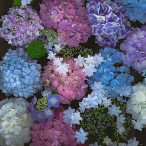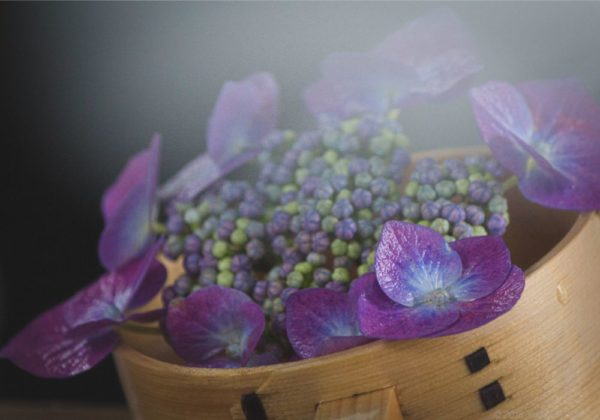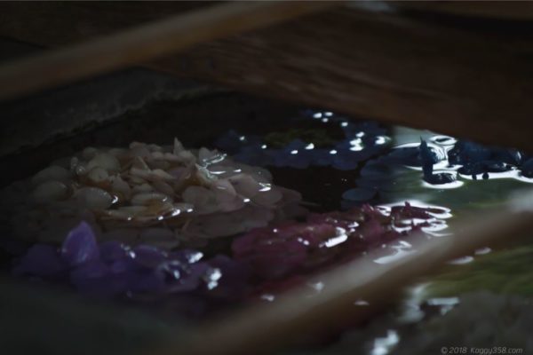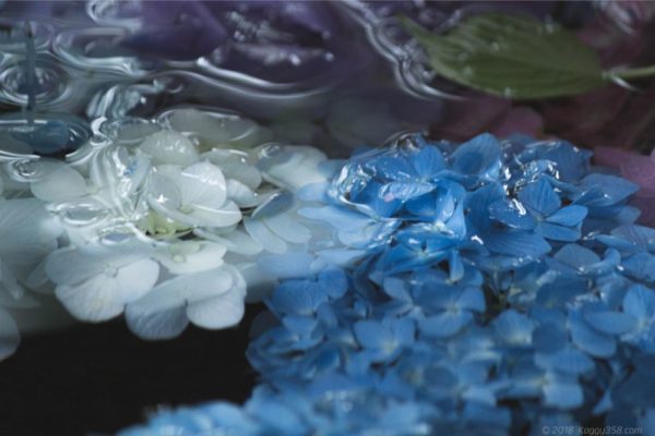 手水舎にうかぶあじさいをローキー(暗く)して、妖艶さをだしてみました。