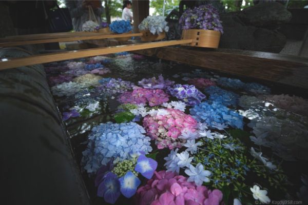 手水に浮かぶあじさいだけでなく、柄杓などもメインに。(数カット撮ってすぐにあじさいは元に戻しました。)
