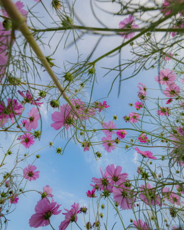 ちなみに広角レンズを使って、真下から仰ぐように撮影をすると、コスモスと青空を写すことができます。