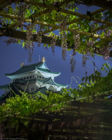 約660メートルの藤の回廊があり、藤棚自体はライトアップはありませんが、夜の22~23時ぐらいまで名古屋城が毎日ライトアップされているので、藤と白を絡めた写真を撮影することができます。