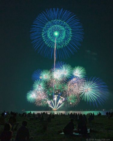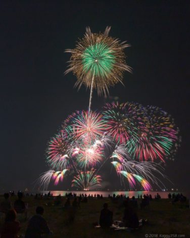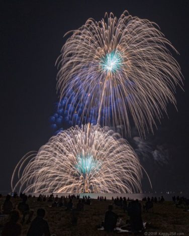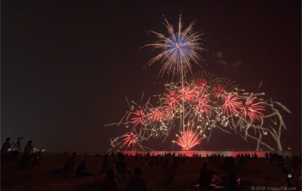 手前と奥の花火の大きさの差が激しいのが分かりやすい一枚です。