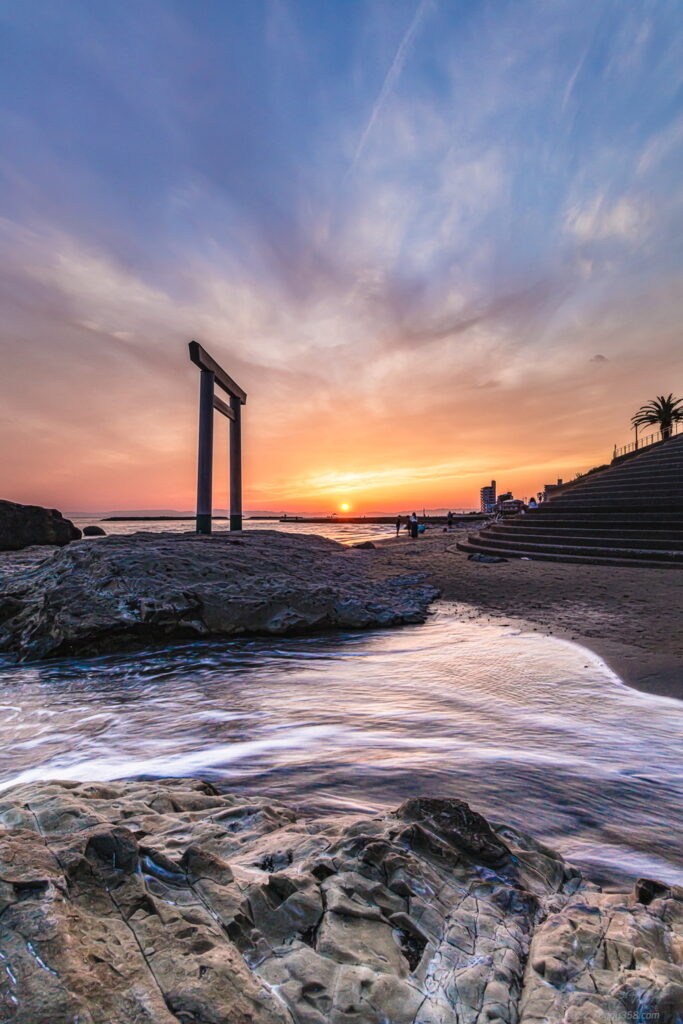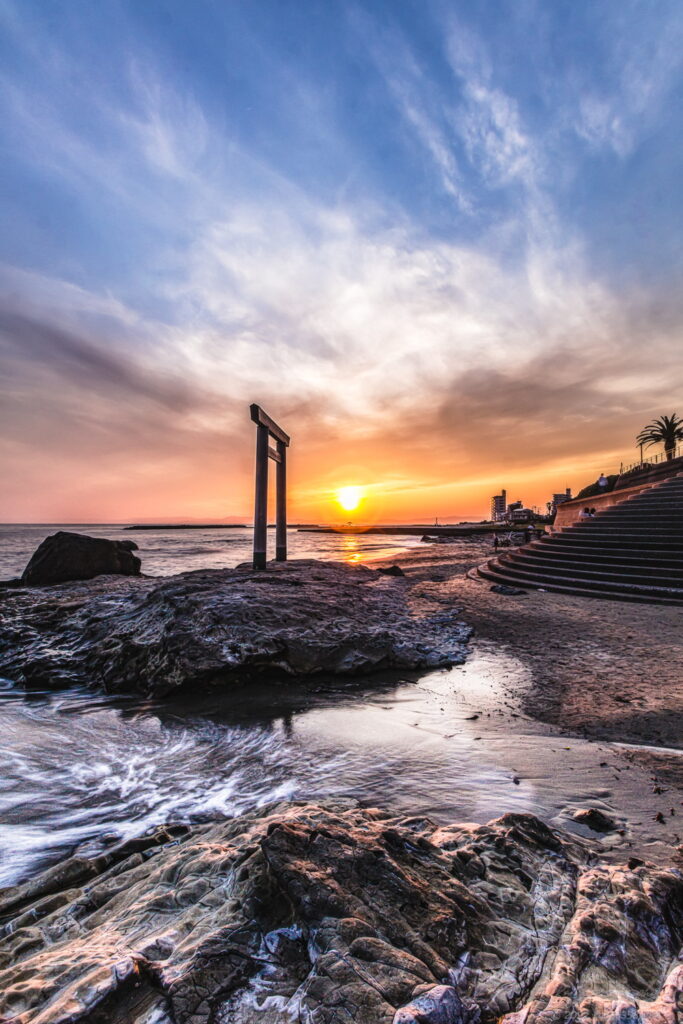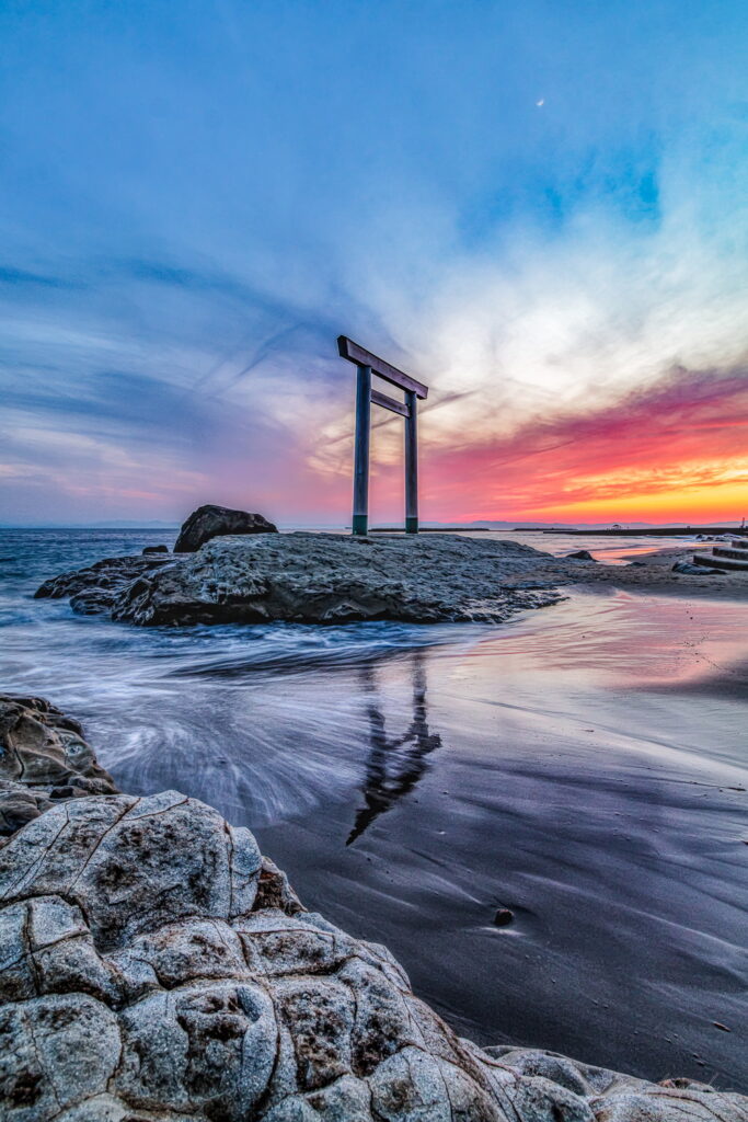 つぶて浦の鳥居と夕焼けのマジックアワーを撮影
