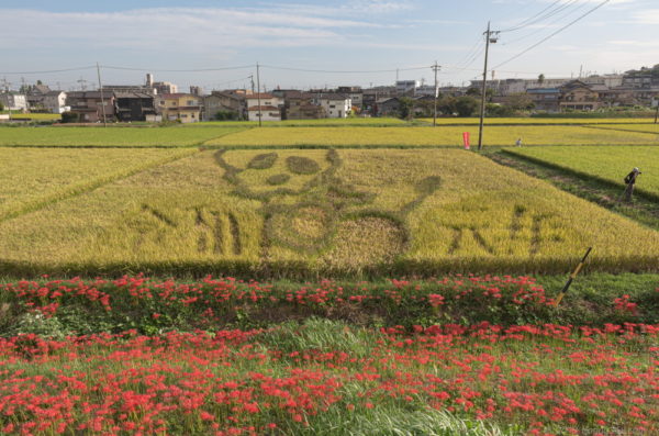 会場から少し東側、渡り石がある場所辺りの田んぼに稲刈りをしてアートが作ってあります。