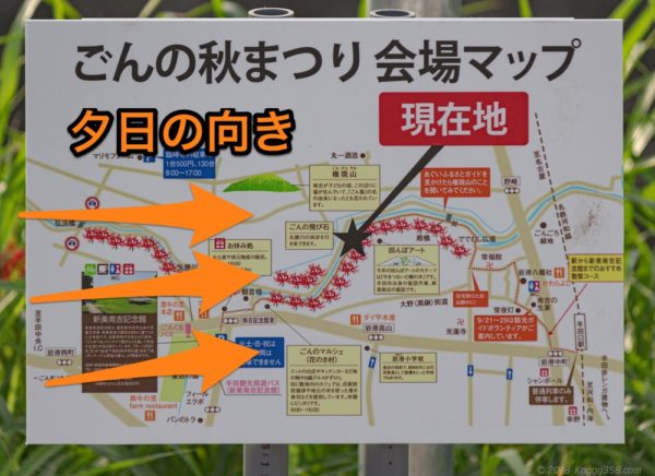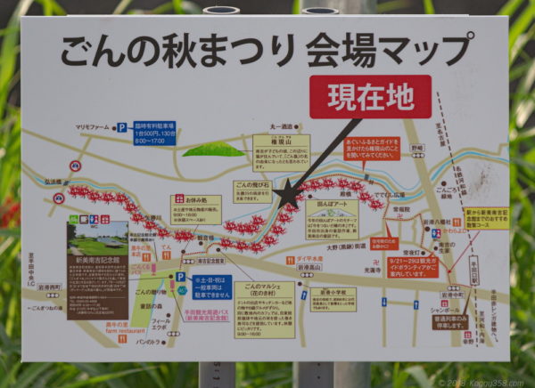 ごんの秋まつりの会場(南吉記念館)では紙媒体の会場マップが貰えたり、矢勝川の所々には現在地マップの看板も立っています。