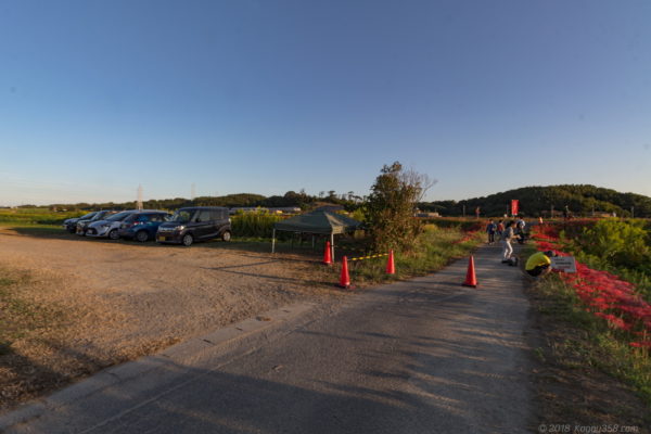看板で「ひがんばな 臨時駐車場(無責管理)」と書いてあり、矢勝川へ繋がる道路は封鎖されていたので、公式で停めていい場所だと思います。