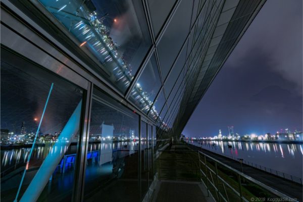 こちらは四日市ドームの階段を登り踊り場から、ガラス張りの壁に工場群をリフレクションさせています。